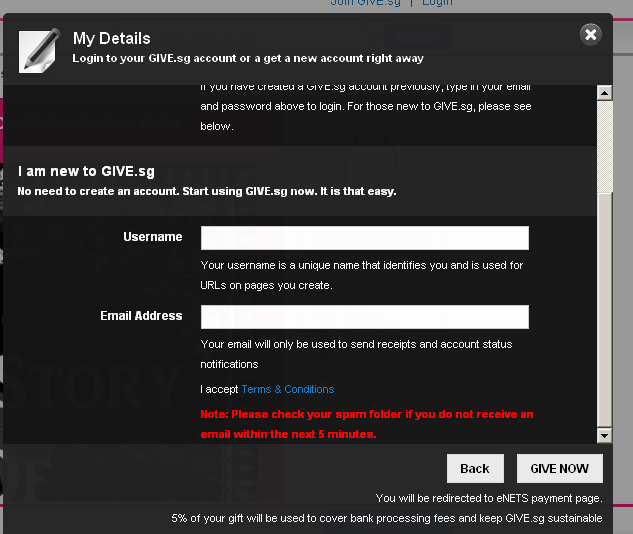 Ok. First you go to their Give.sg page and then click at the bottom how much you want to donate. If you refresh, you can see you can either choose $10, $20 or $50 for specific things like subsidize art materials, cost of art instructor, framing costs or the cost of exhibition set up. Or you can even input how much you want to give. Click the give now button and this window will pop up!